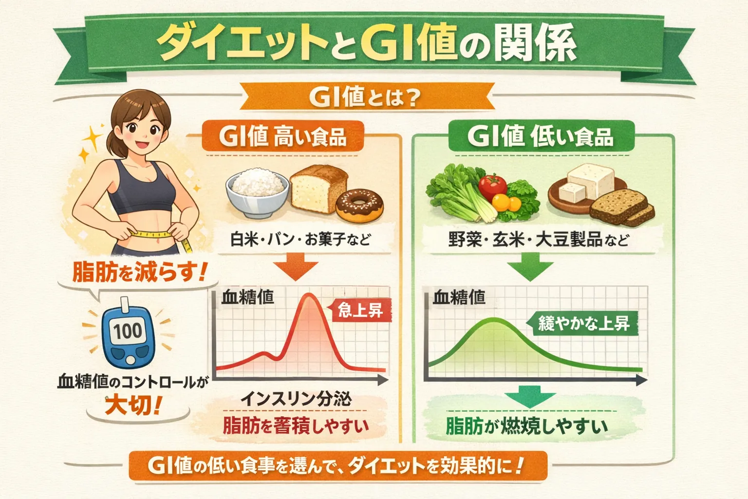 血糖値管理には、単に糖質を減らす食事制限だけでなく、GI値を意識した食品選びが非常に重要です。なぜなら、高GI値の食品を摂ると血糖値が急上昇しやすく、インスリンの過剰分泌や糖尿病リスクが高まるからです。