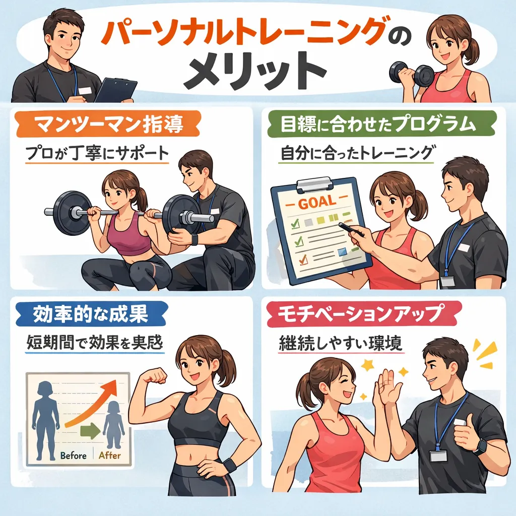 パーソナルトレーニングの最大の魅力は、トレーナーが常に寄り添いサポートしてくれる点です。運動が苦手な方や初心者でも、個々の悩みや体調に合わせて細やかな指導を受けることで、安心してダイエットに取り組めます。
