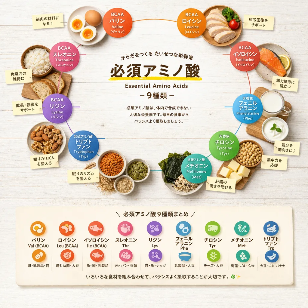 | 必須アミノ酸 | 基礎代謝維持・筋肉保持 | 卵・魚・豆製品 |