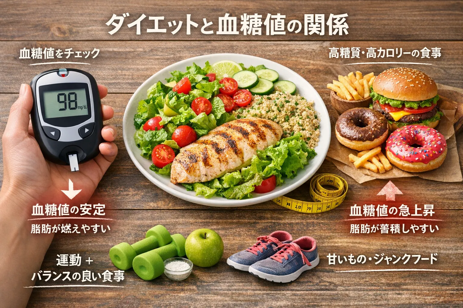 ダイエットと血糖値には密接な関係があります。体重が増加するとインスリンの働きが低下しやすく、血糖値が高くなりやすい状態となります。逆に、適切な減量を行うことでインスリン感受性が向上し、血糖値の安定に繋がります。