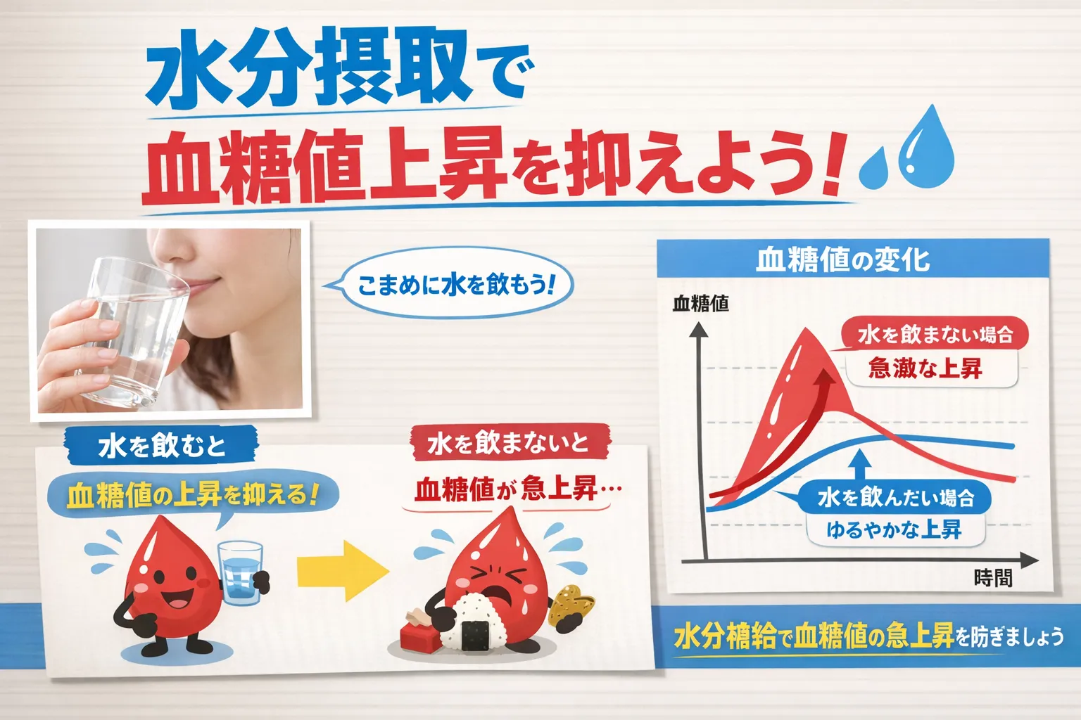 | 糖質の多い食事時に水 | 血糖値上昇を緩やかに | 血糖値の安定を感じる |