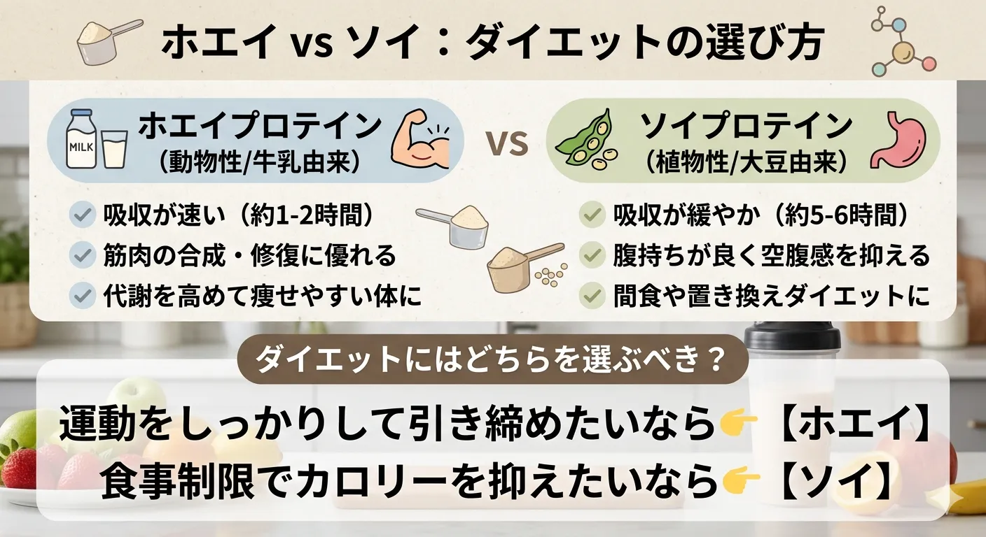 ダイエットで効果的に痩せるためには、ホエイプロテインとソイプロテインの使い分けがカギとなります。運動直後は筋肉の回復を早めるためにホエイプロテインを摂取し、朝食や間食、夜の置き換えには腹持ちの良いソイプロテインを活用するのが一般的です。