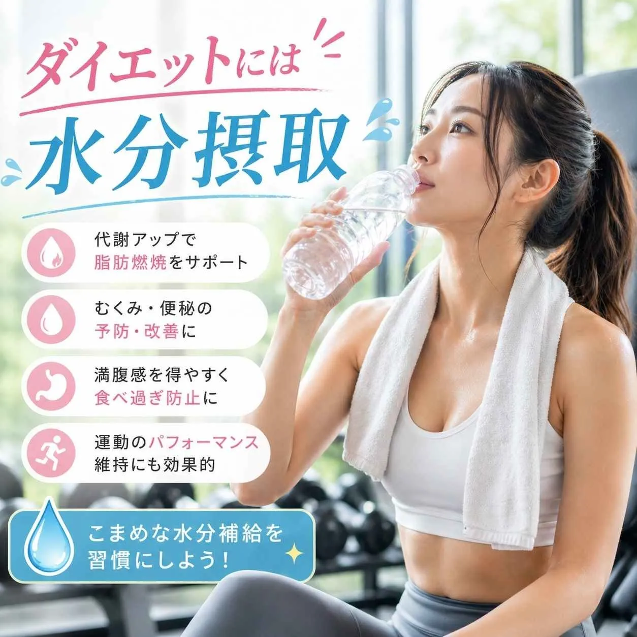 パーソナルジムでのトレーニング中は、汗や呼吸によって思った以上に水分が失われます。こまめな補給を怠ると、代謝が落ちてダイエット効果が出にくくなるケースも少なくありません。